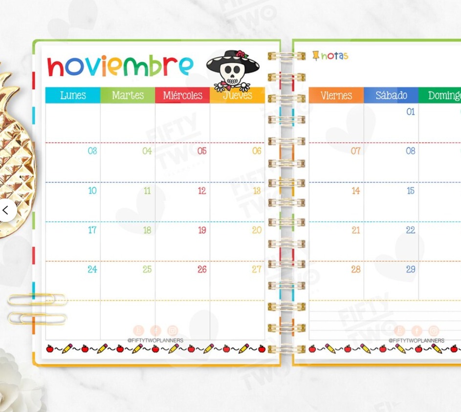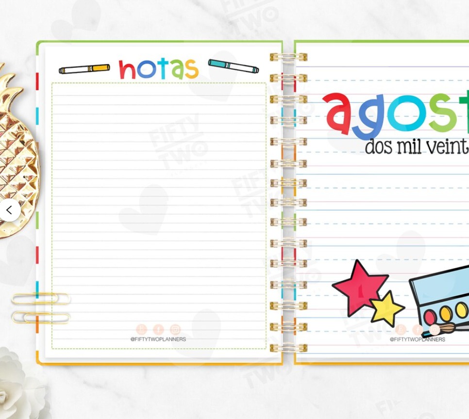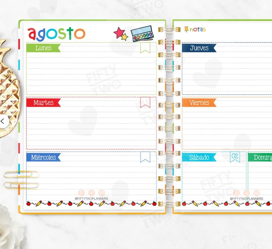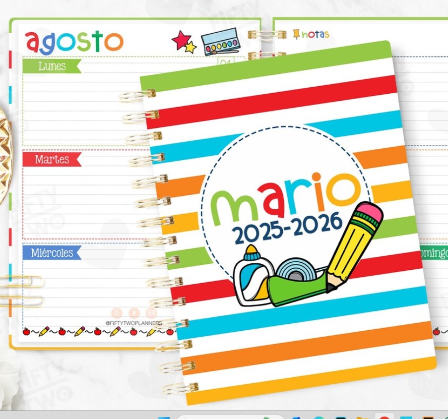 Agenda escolar con portada personalizada. Tamaño media carta (8.5×5.5 pulgadas). Ideal para organizar tareas y actividades.