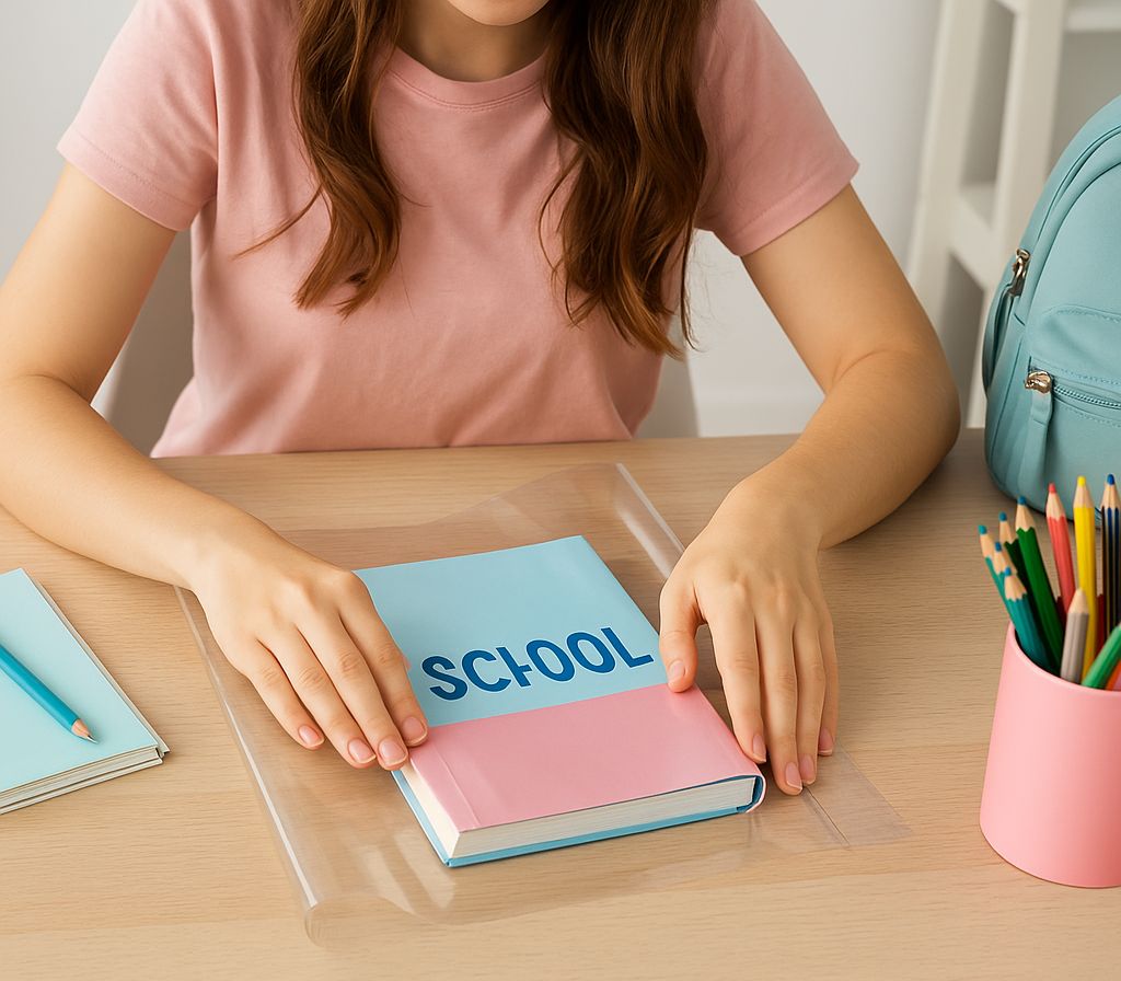 Servicio de forrado para libros de texto grandes con material transparente tipo Clear. Protección y presentación impecable.