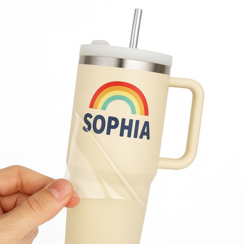 Sticker individual con impresión UV DTF. Impermeable, resistente y de larga duración.